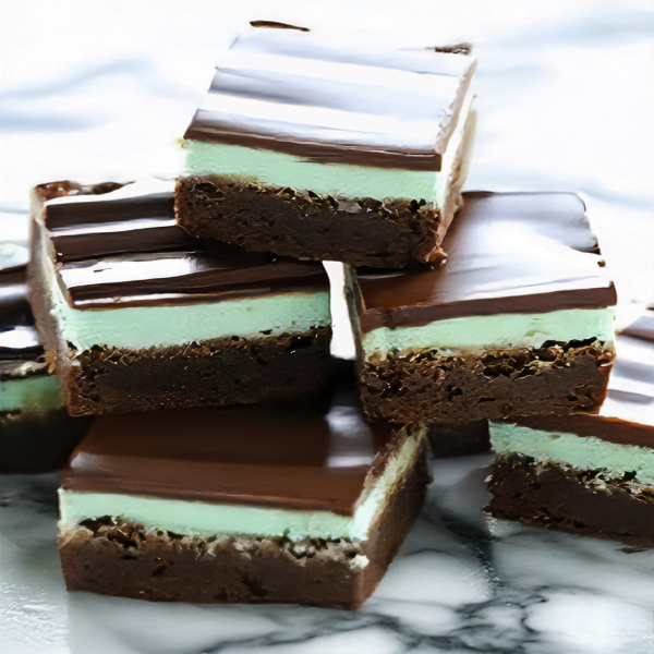 Decadent chocolate brownies topped with mint-scented creamy frosting and a layer of chocolate ganache.